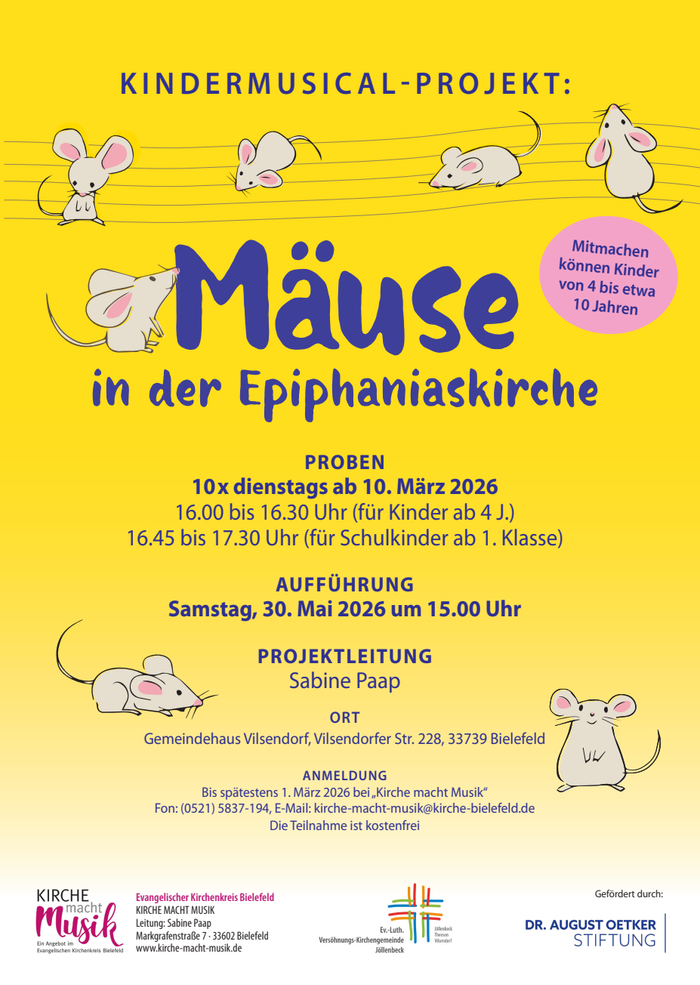 „Mäuse in der Epiphaniaskirche“ erzählt davon, dass Mäuse die Kirche erobert haben. Sie wohnen in der Orgel und haben dort jede Menge Spaß. Die Mäuse sorgen aber auch für Durcheinander und Aufruhr, wenn sie während der Gottesdienste durch die Bankreihen huschen oder in der Nacht wilde Partys feiern. Das Presbyterium ist zunächst ratlos und denkt dann, dass eine Katze das „Problem“ bestimmt lösen kann. Doch der Plan geht nicht auf, und die Geschichte endet anders als gedacht …