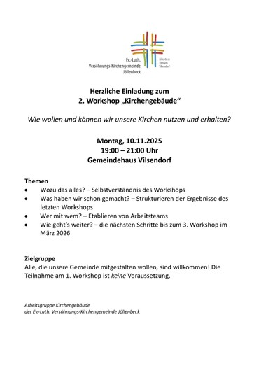 Nach dem erfolgreichen 1. Ideenworkshop „Kirchengebäude“ am 22. September wollen wir die dort angedachten Ideen weiterentwickeln und konkretisieren.