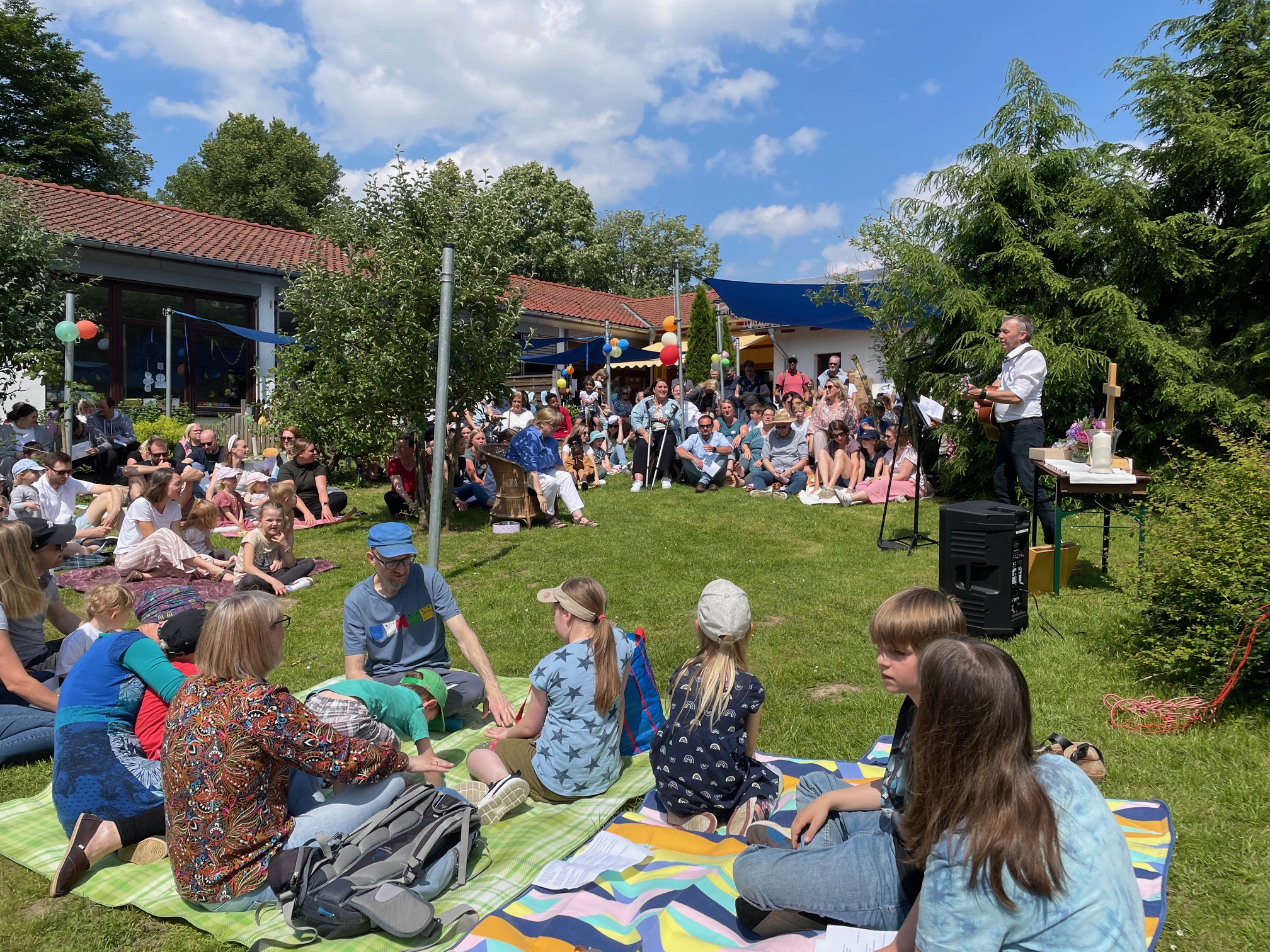 Freiluft-Gottesdienst auf der Kita-Wiese: Pfarrer Lars Prüßners Gitarre ersetzt die Orgel bestens.