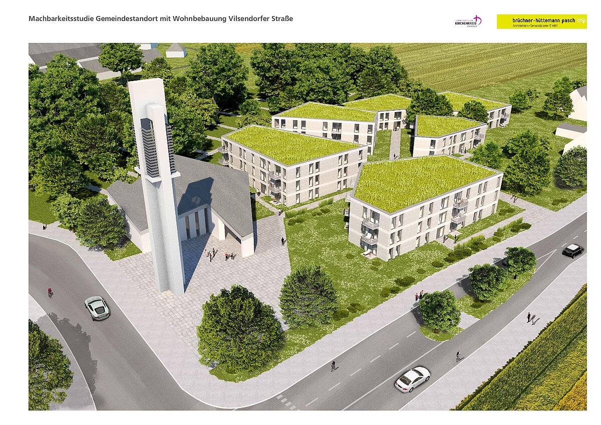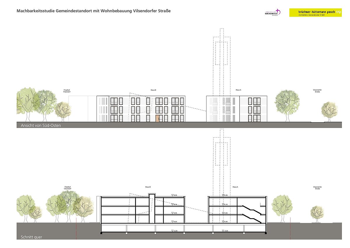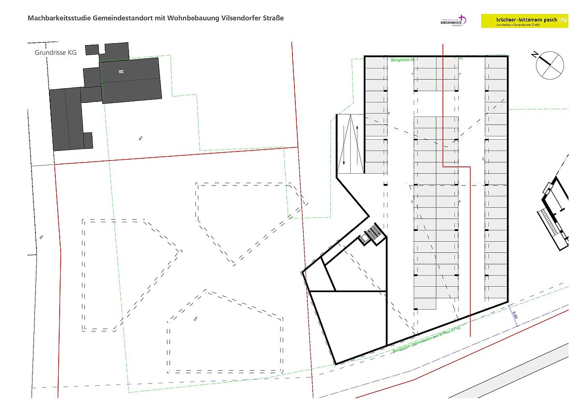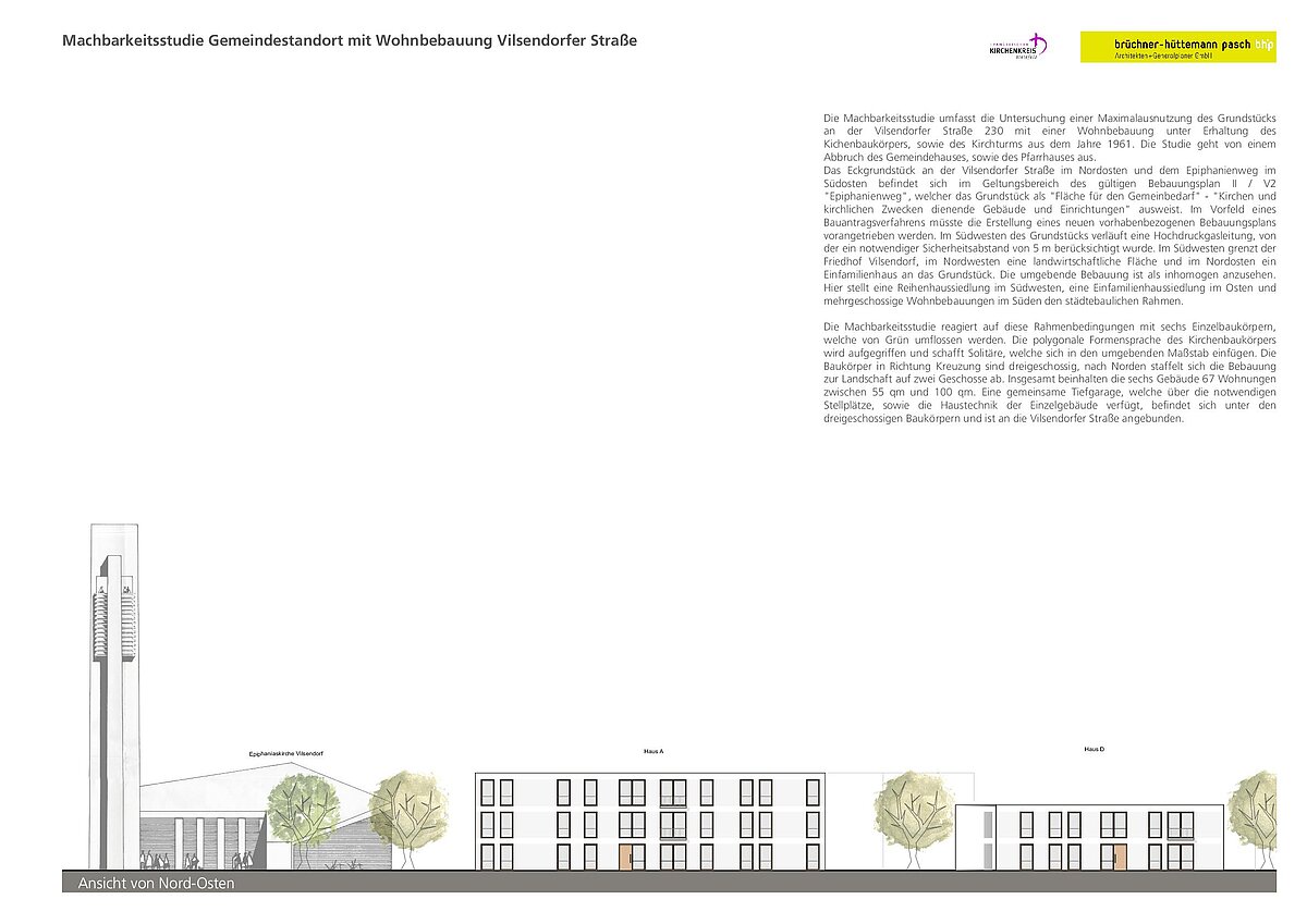 Die Machbarkeitsstudie umfasst die Untersuchung einer Maximalausnutzung des Grundstücks an der Vilsendorfer Straße 230 mit einer Wohnbebauung unter Erhaltung des Kichenbaukörpers, sowie des Kirchturms aus dem Jahre 1961.