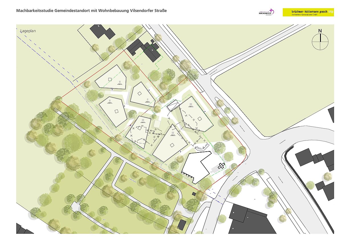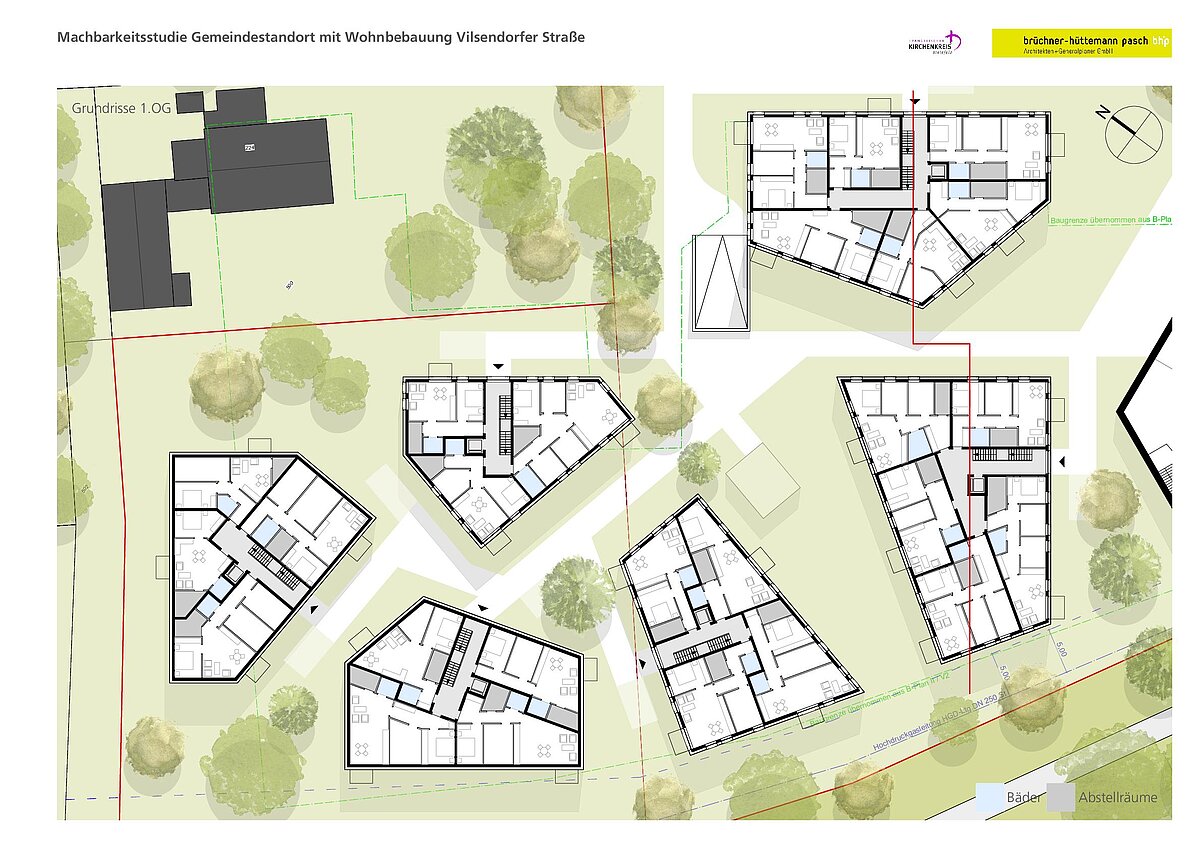 Die Machbarkeitsstudie reagiert auf diese Rahmenbedingungen mit sechs Einzelbaukörpern, welche von Grün umflossen werden. Die polygonale Formensprache des Kirchenbaukörpers wird aufgegriffen und schafft Solitäre, welche sich in den umgebenden Maßstab einfügen.